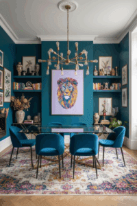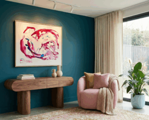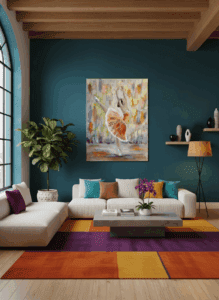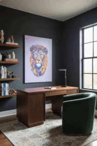 For the interiors that aren’t afraid of the dark. This gallery showcases how VIVA art interacts with deep wall tones, velvet textures, and moody lighting. Whether against a emerald green library or a charcoal dining room, these pieces provide the high-contrast “pop” that defines a luxury eclectic home.